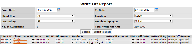 Write off reason: this column shows the reason as to why the amount was waived off. e.g. Manager’s approval, an old client
