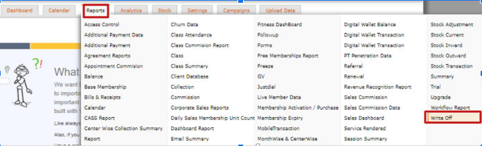 Click on Reports → Write Off (You will land on the page shown below).